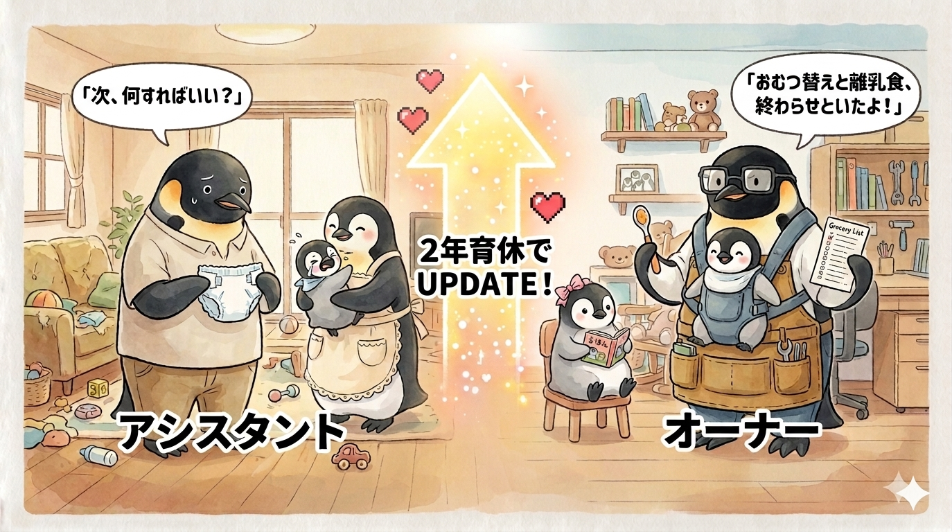 - 現在(共同オーナー型): 24時間体制で育児に「並走」し続けることで、情報の解像度が上がりました。子供のわずかな変化に気づき、次に必要な備品を予測し、トラブルが起きても「妻と対等に解決策を議論」できる。